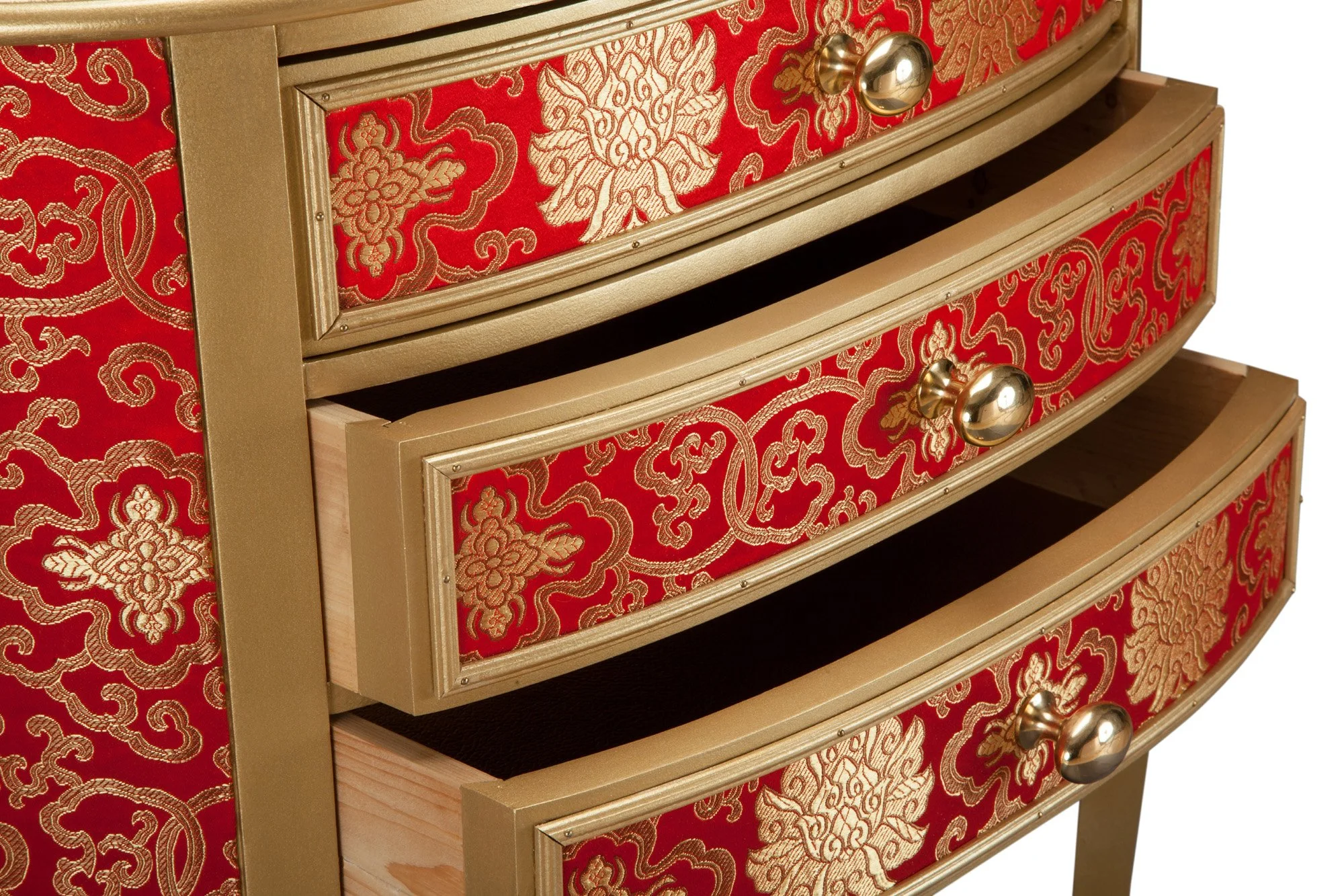 De lätt s-formade benen och övriga synliga trädetaljer är lackerade i guldfärg. Byrån är beklädd med impregnerat tyg i rött och guld med influenser från fjärran östern.