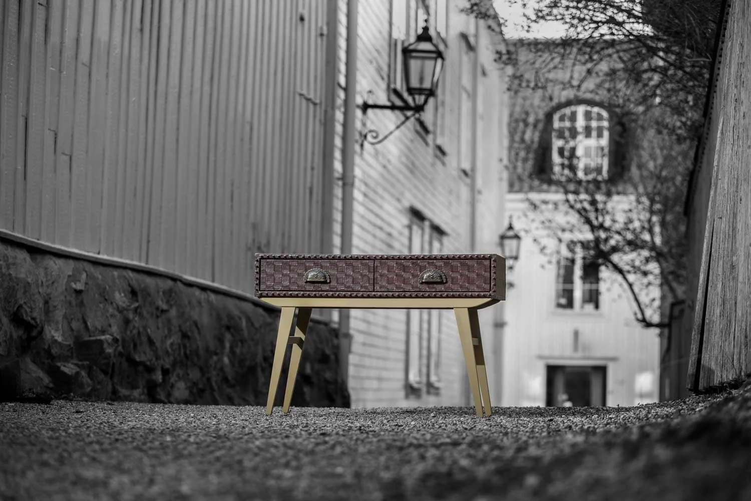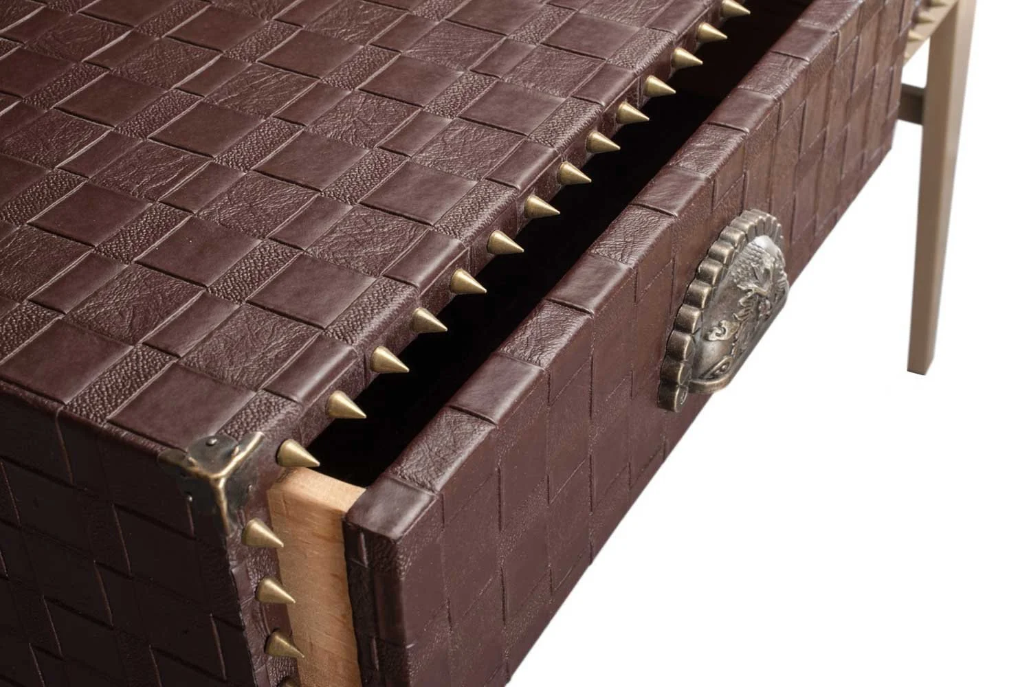 Klädd med mörkbrunt, mönsterpräglat konstskinn där de två lådorna, med skålformade dekorativa handtag, inramas av spetsiga nitar.